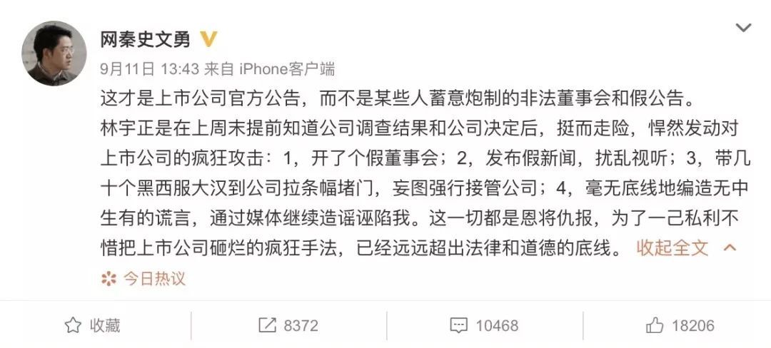史文勇在微博作出回复:“林宇正是在上周末提前知道公司调查结果和公司决定后,铤而走险,悍然发动对上市公司的疯狂攻击:1,开了个假董事会;2,发布假新闻,扰乱视听;3,带几十个黑西服大汉到公司拉条幅堵门,妄图强行接管公司;4,毫无底线地编造无中生有的谎言,通过媒体继续造谣诬陷我。这一切都是恩将仇报,为了一己私利不惜把上市公司砸烂的疯狂手法,已经远远超出法律和道德的底线。”
