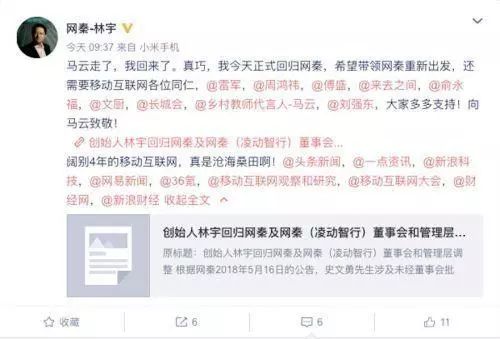 2018年9月10日早晨9点,天空灰蒙蒙的,网秦公司创始人林宇在微博上宣布,“我今天正式回归网秦”,并且@了雷军、周鸿祎、马云、刘强东等互联网界巨头,在他最辉煌的时代,他曾经和他们并驾齐驱。