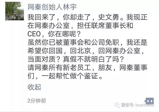 “我回来了,你却走了,史文勇。我现正在网秦办公室,担任联席董事长和CEO,你在哪呢?虽然你已被董事会和公司免职,我还是希望你能回国,回北京,回网秦办公室,当面对质?真假不就明白了吗? 请各位媒体做个见证。”