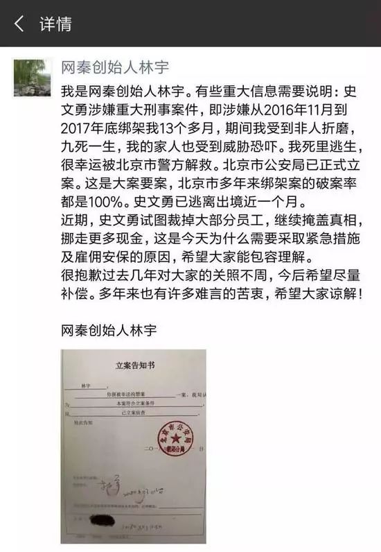 林宇向朝阳公安局报案,并在2018年8月3日拿到了回执,他在朋友圈晒出《立案告知书》,并发文指控史文勇绑架,原文如下: