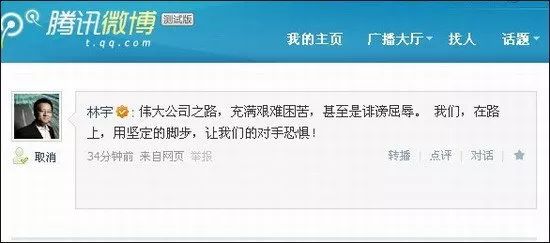 次日早晨,林宇发了一条微博,“伟大公司之路,充满艰难困苦,甚至是诽谤侮辱。我们在路上,用坚定的脚步,让我们的对手恐惧。”