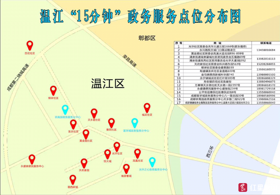 ▲温江"15分钟"政务服务点位分布图