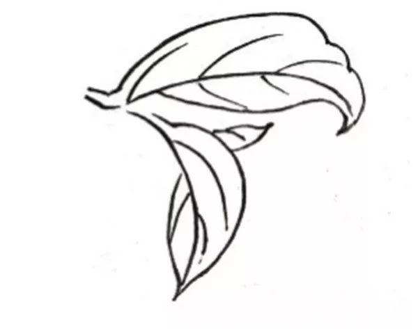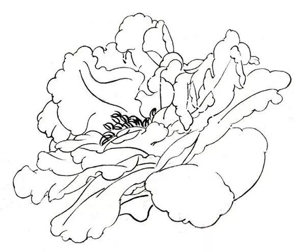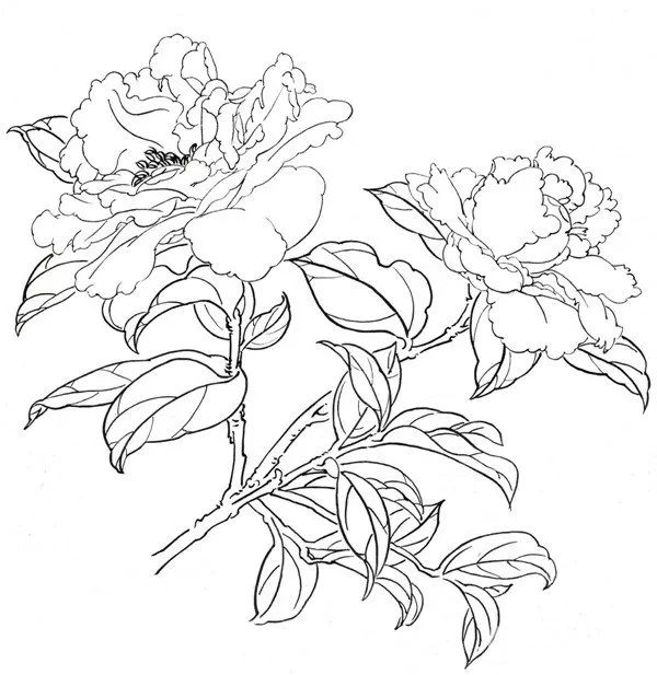枝头两朵芍药花的形态各异,方向不同,花瓣处的线条比较密,在勾画时,要理清思路,下面的叶子要注意整体的方向,花朵和叶子处的线条粗细要有区别。