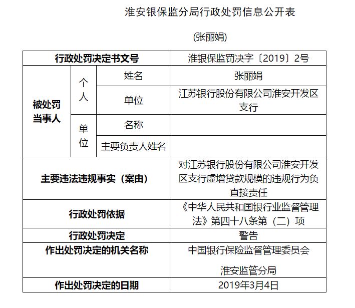 江苏银行股份有限公司淮安开发区支行主要违法违规事实(案由)“江苏银行股份有限公司淮安开发区支行虚增贷款规模的违规行为负直接责任”,相关责任人被予以警告处罚。