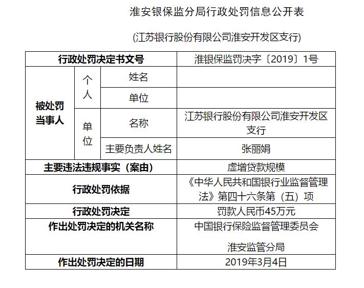 江苏银行股份有限公司淮安开发区支行主要违法违规事实(案由)“虚增贷款规模”,相关责任人被罚款人民币45万元。