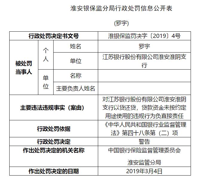 江苏银行股份有限公司淮安淮阴支行主要违法违规事实(案由)“对江苏银行股份有限公司淮安淮阴支行以贷还贷,贷款资金未按约定用途使用的违规行为负直接责任”,相关责任人被予以警告处罚。