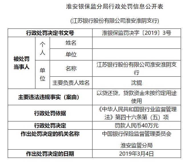 江苏银行股份有限公司淮安淮阴支行主要违法违规事实(案由)“以贷还贷,贷款资金未按约定用途使用”,相关责任人被罚款人民币40万元。