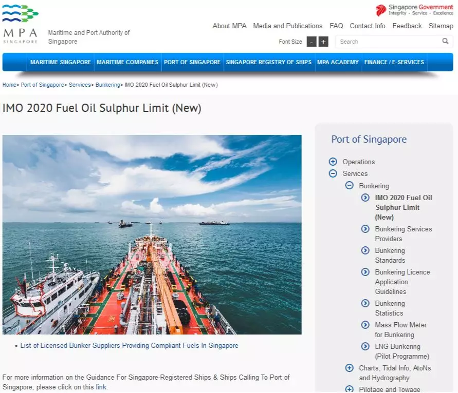网站截图(网站:https://www.mpa.gov.sg/web/portal/home/port-of-singapore/services/bunkering/imo-2020-fuel-oil-sulphur-limit)