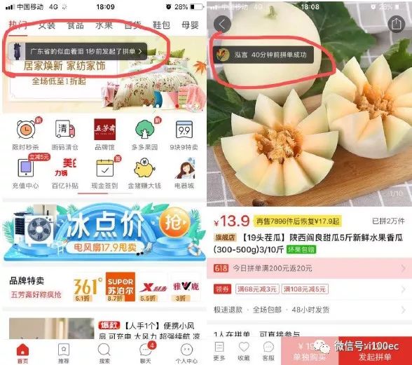 通过界面的颜色对比引导用户选择发起拼单;通过低价优惠使得“电商加社交”模式推广开来,使得用户自发的进行分享和推荐。