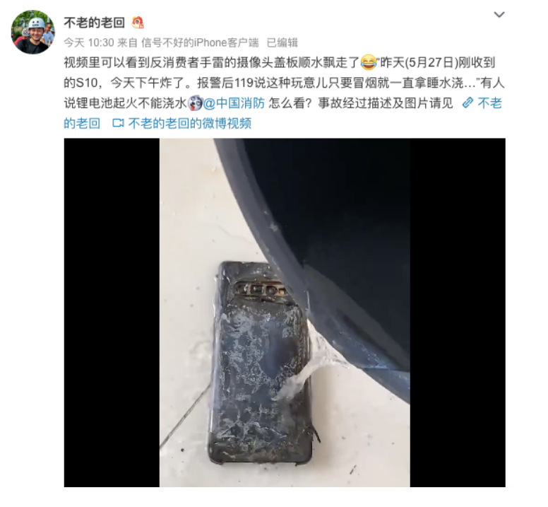 昨日网友在微博爆料,称5月26日在京东自营店购买的三星GALAXY盖乐世 S10刚用了一天就不能充电、冒烟炸裂,随后手机残骸被三星售后收走。等了京东与三星一个月却售后无果。