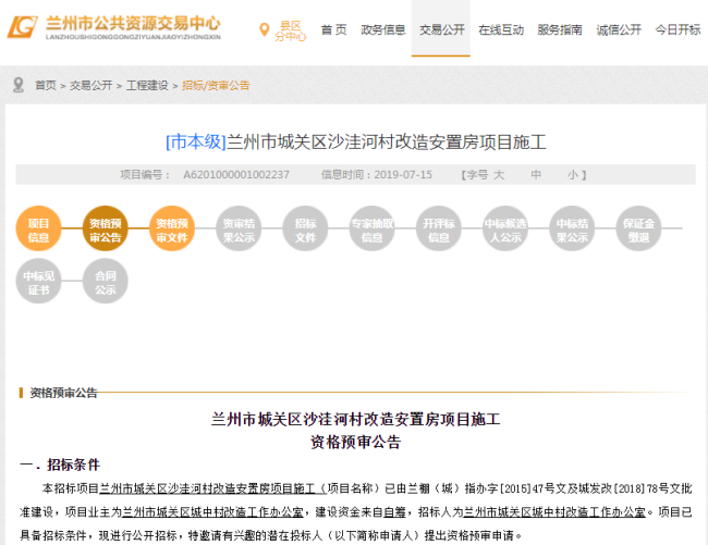 2019年7月15日,兰州市公共资源交易中心发布了兰州市城关区沙洼河村改造安置房项目施工资格预审公告,兰州市城关区改造安置房项目施工已由兰棚(城)指办字[2015]47号文及城发改[2018]78号文批准建设,项目业主为兰州市城关区城中村改造工作办公室,现已具备招标条件。