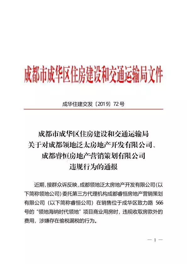近日,成都市成华区住房建设和交通运输局发布了 一则关于 成都领地泛太房地产开发有限公司 、 成都睿恒房地产营销策划有限公司项目违规行为 的 通报。