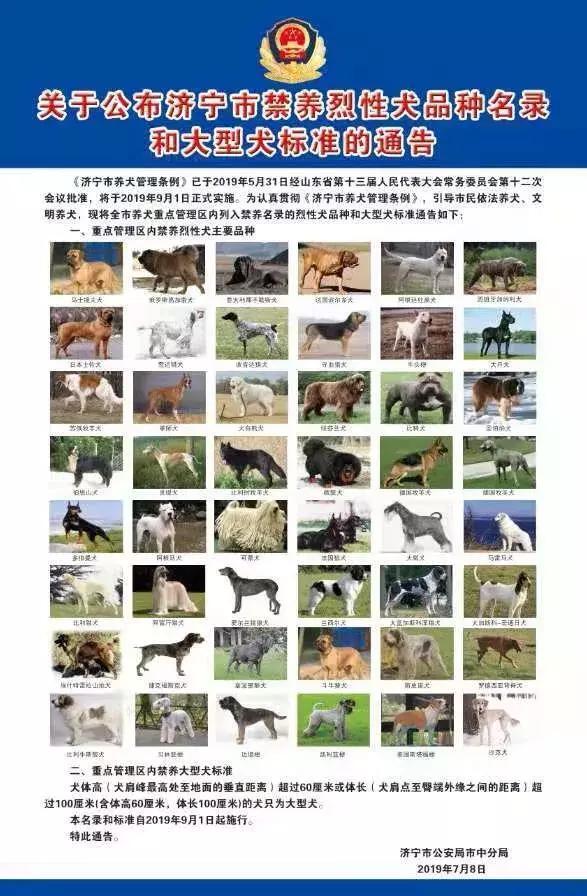 《济宁市养犬管理条例》已于2019年5月31日经山东省第十三届人民代表大会常务委员会第十二次会议批准,将于2019年9月1日正式实施。为认真贯彻《济宁市养犬管理条例》,引导市民依法养犬、文明养犬,现将全市养犬重点管理区内列入禁养名录的烈性犬品种和大型犬标准通告如下: