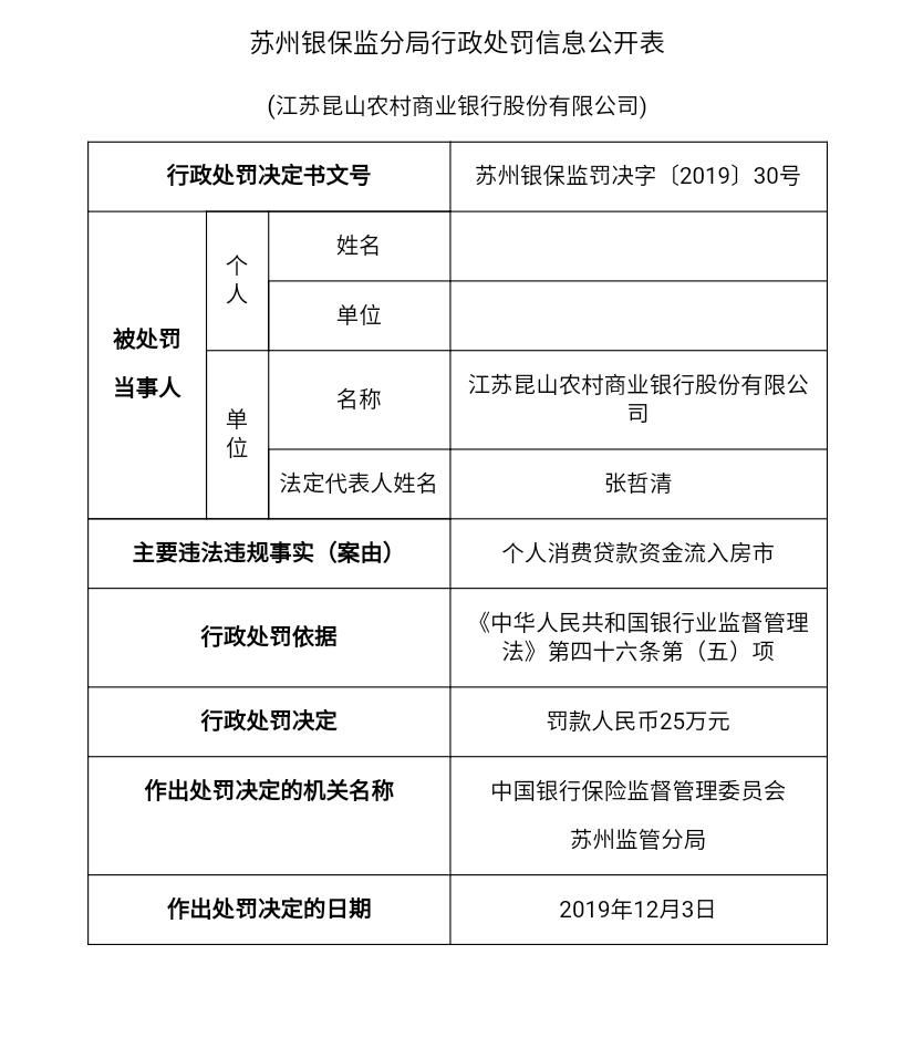 《江苏金融湃》16日获悉,苏州银保监分局近日发布一份行政处罚信息,江苏昆山农村商业银行股份有限公司因“个人消费贷款资金流入房市”,被罚款25万元。