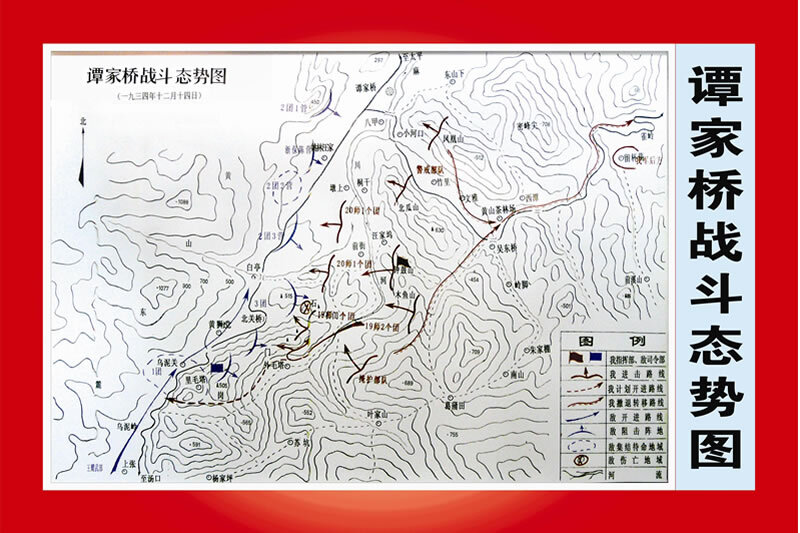 虽然上面这张图绘制的并不十分准确,但基本还是能够如实反映谭家桥战斗的全貌及过程。这里需要特别指出的是,这是一张手绘的图,与谭家桥战斗实际发生地的地理地貌等还是有一定差异的。比如图中“谭家桥”的标识位于八甲的上边(北),“谭家桥镇”实际位于小河口的左下方,隔着麻川河弯曲的河道与八甲遥遥相对。