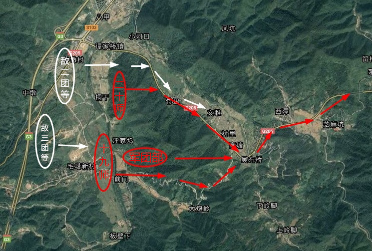参考图:当晚红十军团撤退路线及敌军追击路线(谷歌截图)