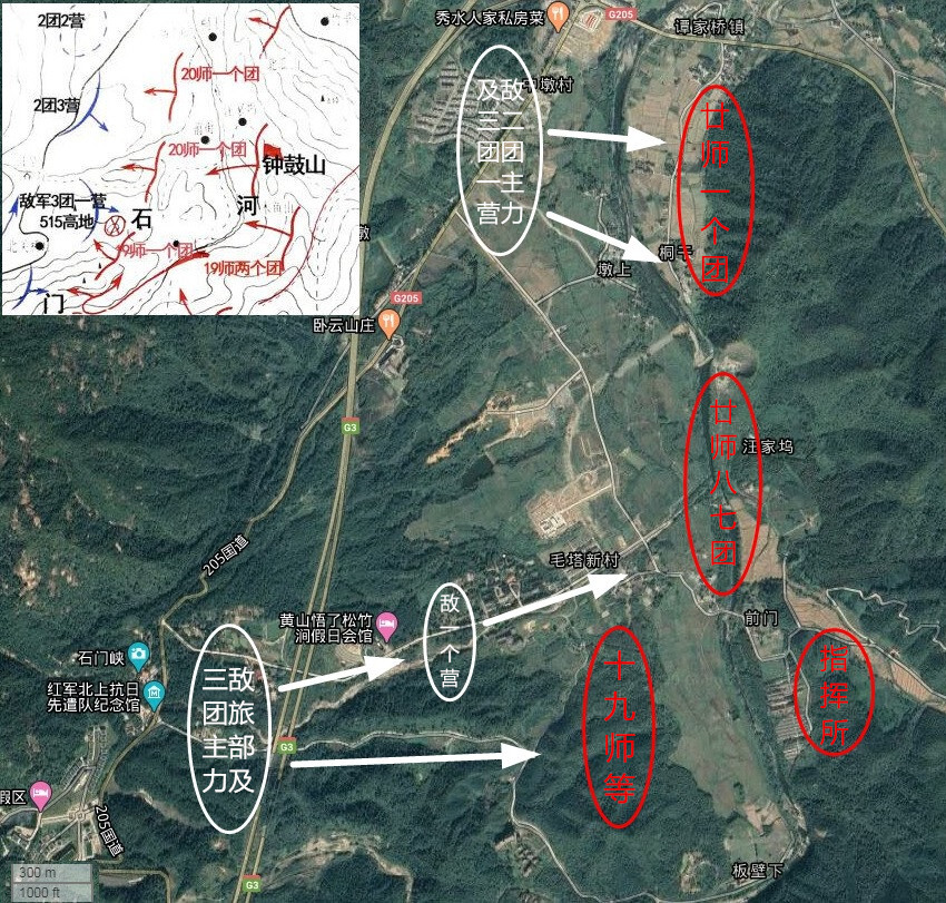 第二个“段子”更是异想天开!将王耀武回忆的其前卫团“号长在吹号时暴露了目标,被红军打伤,倒在地下”,描绘成粟裕眼疾手快,抬手一枪,将其击毙在地!打开电子地图测量一下,红十军团临时指挥所与敌周志道团部之间的空中直线距离超过一千五百米,所以无论粟裕的眼有多疾、手有多快都没有射中的可能!唯一的可能,就是其时粟裕待在红五十六团最后面(北)那个连的阵地上,可如此一来,红十九师只以一个连控制石门岗制高点的“安排错误”,身为军团参谋长的粟裕又怎能脱得了干系!