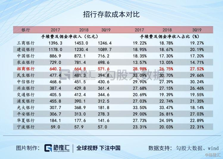 而扩大非息收入是另一个保证银行不受经济周期影响的增长点,而且非息收入不用消耗银行的资本金,是银行实现轻资产增长的必争之地。19年前三季度招行中间收入规模571.6亿元,仅次于中、农、工、建四大行;在营收中占比达27.5%,仅次于中信和民生,较10年提升11.6pct。