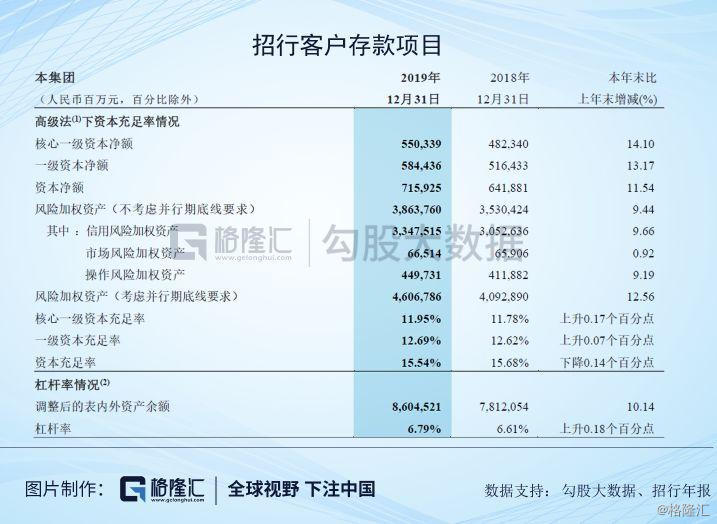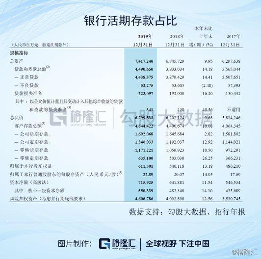 2019年,招行总资产74172.4亿,同比增长9.95%。其中贷款总额42773亿,同比增速14.06%。总负债67995.33亿,同比增长9.63%。其中,客户存款48749.81亿,同比增加10.11%。其中零售存款的增速高达15.57%,突出招行零售业务继续保持优势。