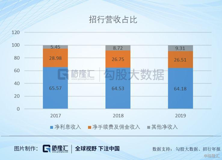 2019年,招行利息收入占比总营收64.18%,非利息收入占比26.51%,其他收入占比9.31%。利息收入占比整体呈现缓慢下降的趋势。