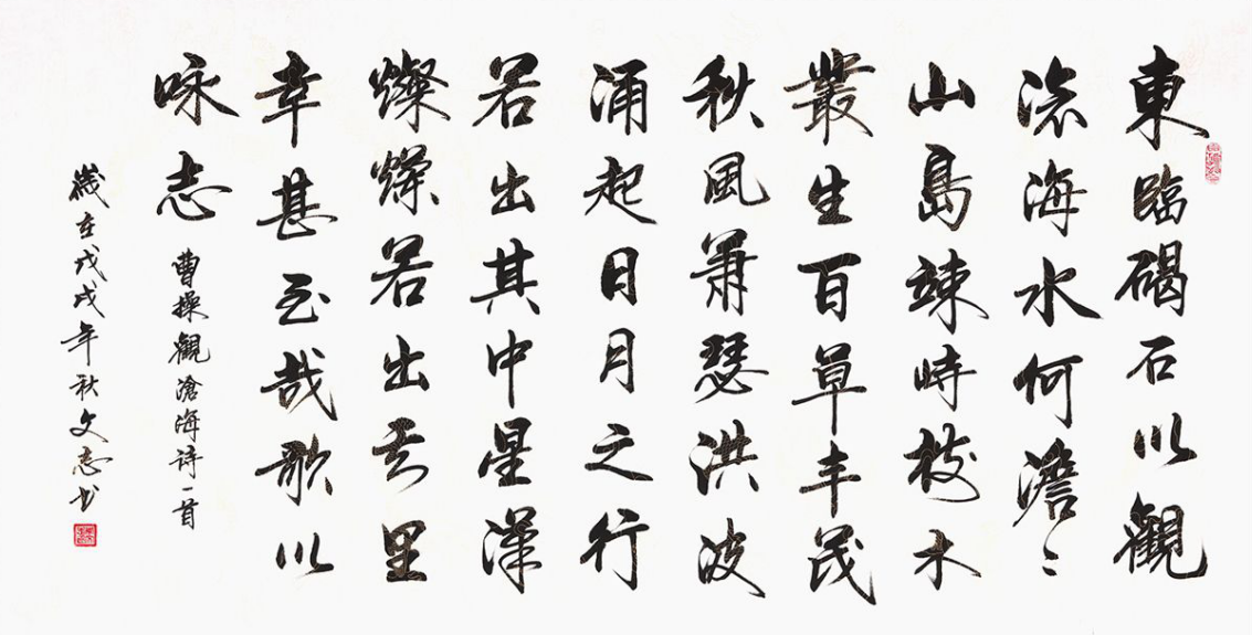 《观沧海》是中国文学史上一首完整的写景诗,也是一首抒情诗,充分表达了他豪迈乐观的豁达品质。这样一首气势豪迈又乐观进取诗词,自然是企业办公室经典装饰画。