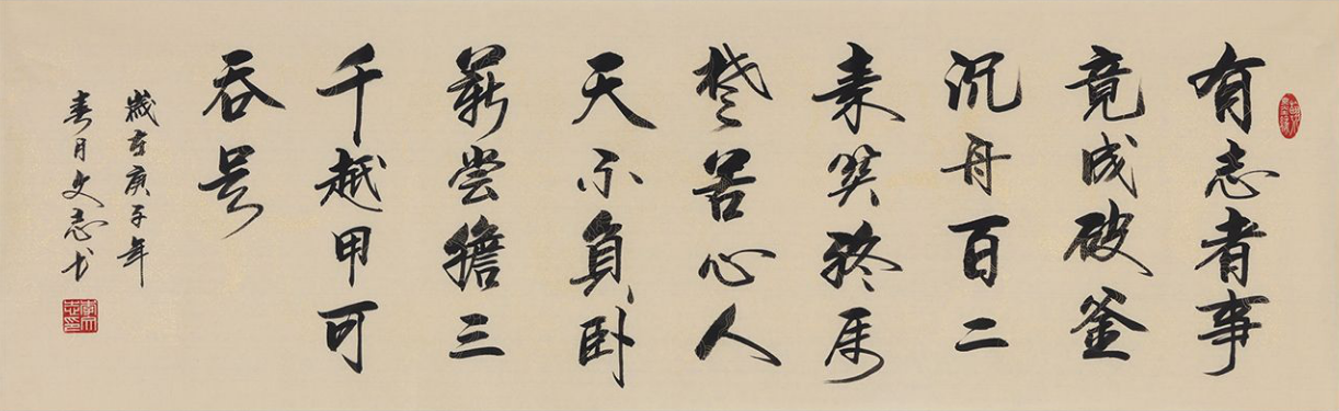 主要就是以「项羽灭秦」和「勾践破吴」两件史事,说明有志者,事竟成。蒲松龄为表达他创作《聊斋道志异》不达目的不甘休的意志与决心,用项羽大破秦兵和勾践天吴雪耻的史事来激励自己,鼓舞自己。同样,如此有激励意义的励志名言,经当代书法家李文志老师书写,也适用于办公室内悬挂,用于自我激励。