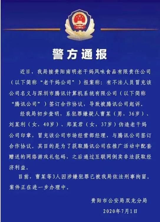 贵阳警方:3 人伪造老干妈印章与腾讯签合同