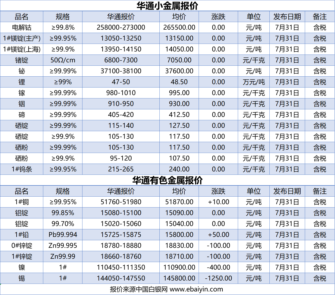 上海华通报价7月31日讯:电解钴、1#镁锭(生产)、1#镁锭(上海)、锗锭、铋、锂、镓、铟、碲、硒锭(99.99%)、硒锭(99.9%)、硒粉、硒粉(99.9%)、1#钨条报价