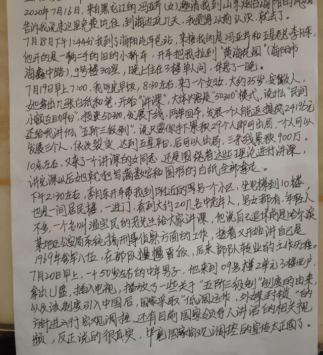 7月19号早上七点,我吃完早饭,八点半来了一个中年妇女,大约35岁,安徽人。她拿出几张白纸和笔,开始讲课,大致内容50300模式。说什么民间小额互助平台,投资50300 ,发展下线,两单回本,发展一个人能返提成24196元,还给我讲什么”五阶三级制”,说只要你手下累积29个人即可出局,一个人可以发展三个人,依次裂变,达到五星平台后可以出局,三条线累积900万。10点左右,又来了一个讲课的女同志还是围绕着这些理论进行讲课,讲完以后她就把写满数字和图形的白纸全部拿走。