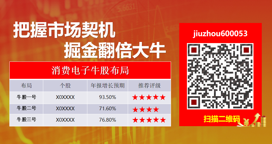 为此,我们通过深入研究,从消费电子板块中,精选出3支有望起爆的潜力龙头,今日与大家共享。与此同时,如果操作中经常错失热点,踏不准节奏,可添加微信【jiuzhou600053】分享每日行情机会,更有机会获得免费一周实战指导,与强者同行!