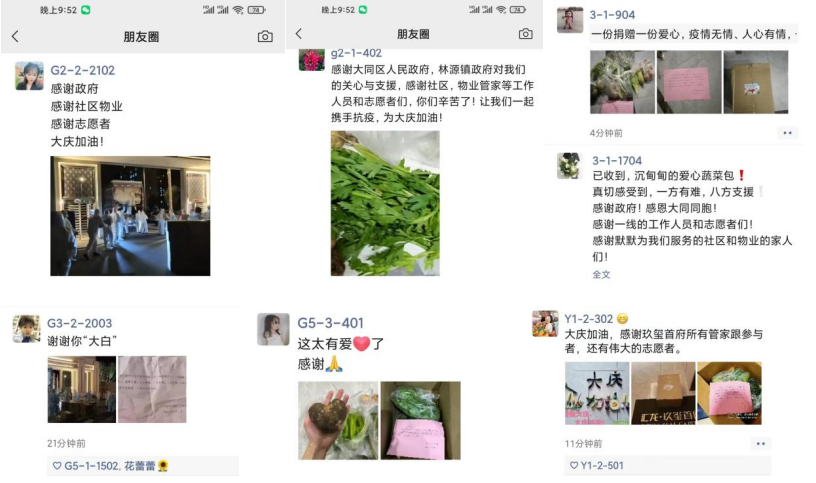 收到蔬菜包的业主也在朋友圈里纷纷“晒”起了幸福,玉米、土豆、南瓜、茄子、青椒、洋葱……满满一大箱子的新鲜蔬菜令他们感动不已,“雪中送炭”、“谢谢你大白”、“你们辛苦了”、“感谢政府、感谢社区物业、感谢志愿者”、“这太有爱了”、“大庆加油”......一句句的感谢话语,是业主们对欣汇龙物业员工以及政府、社区、志愿者的真情回馈。