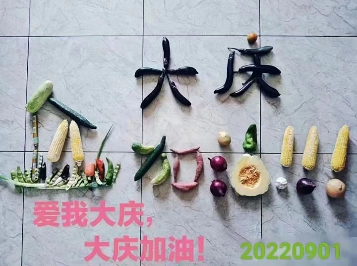 图:一户居民将蔬菜拼成了“大庆加油”的字样