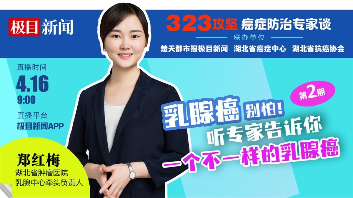 4月16日上午9时,“323攻坚—癌症防治专家谈”栏目的第二场,将有幸邀请到从事乳腺肿瘤工作20余年,擅长乳腺良恶性肿瘤的诊断和治疗,尤其是乳腺癌保乳整形修复术、乳腺癌改良根治术及Ⅰ/Ⅱ期乳房再造术等手术治疗,对乳腺癌的早期诊断和系统规范化治疗有较深入的研究的湖北省肿瘤医院乳腺中心牵头负责人郑红梅主任,请她来为广大女同胞科普乳腺癌防治话题,听她告诉你一个“不一样”的乳腺癌。