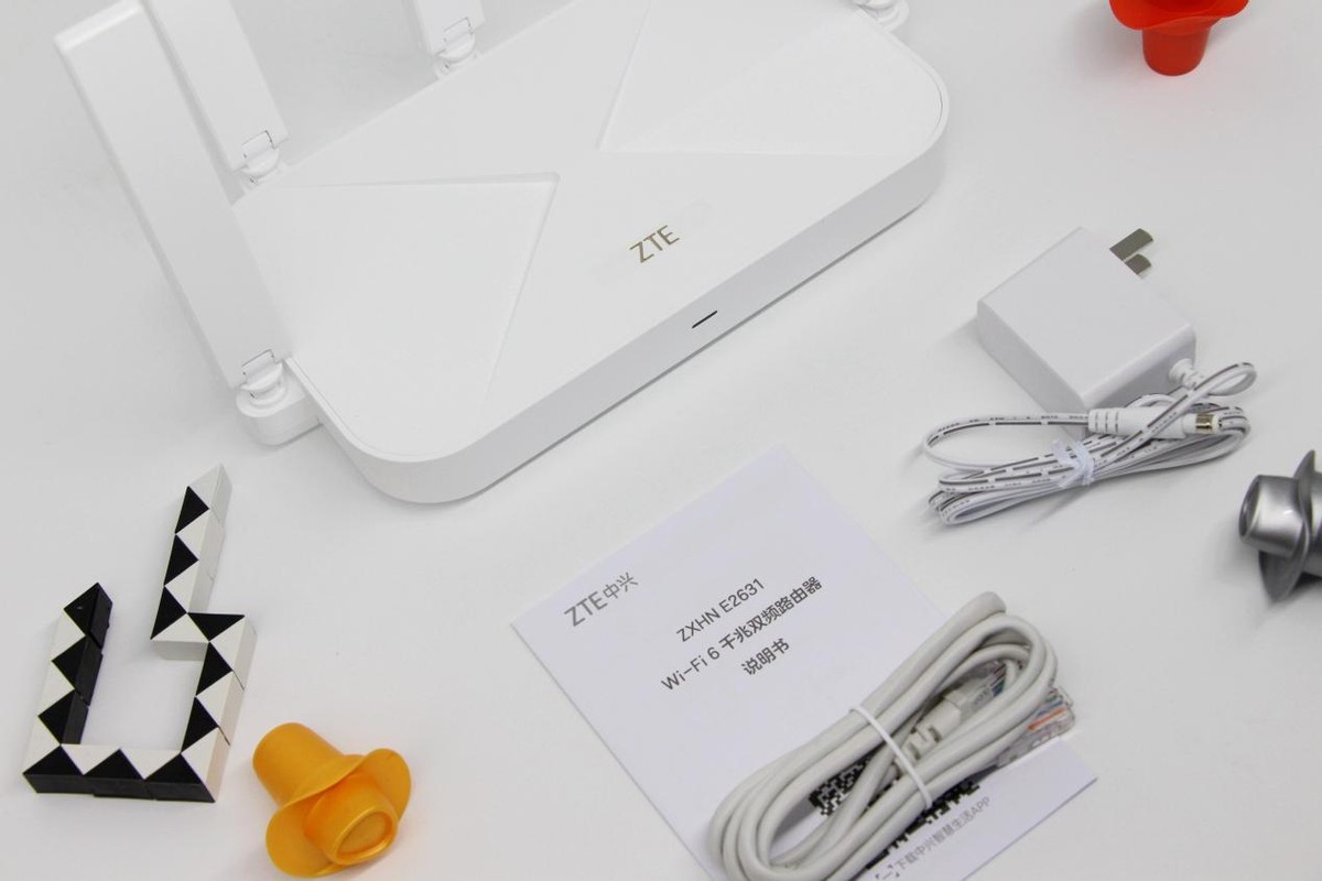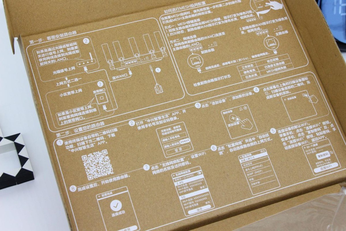 打开包装盒,在包装盒内部居然有完整的路由器安装组网流程,这一个页面全都展示了整个过程,很实用。包装盒里面就是这款中兴AX3000巡天版路由器了,塑料包裹,防尘防土。