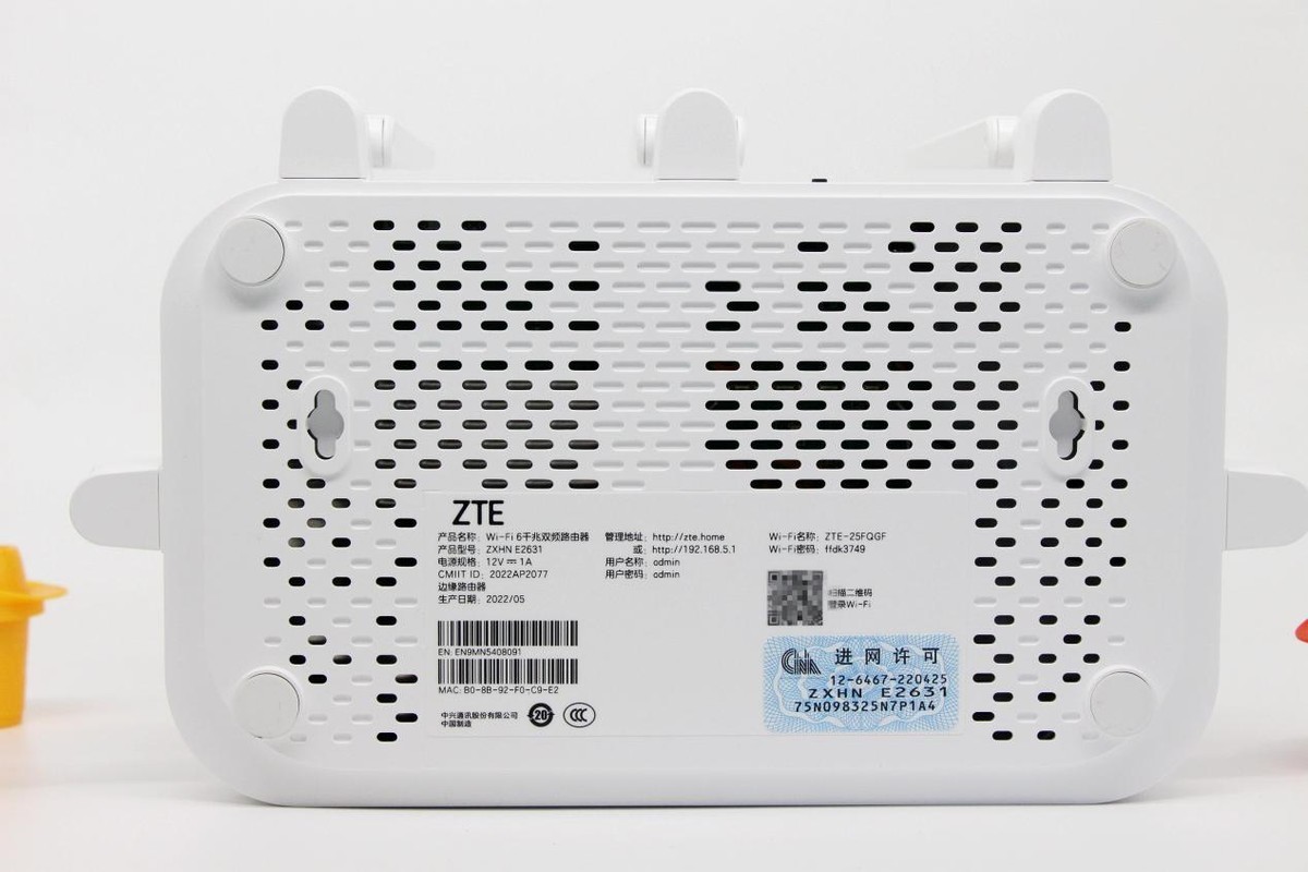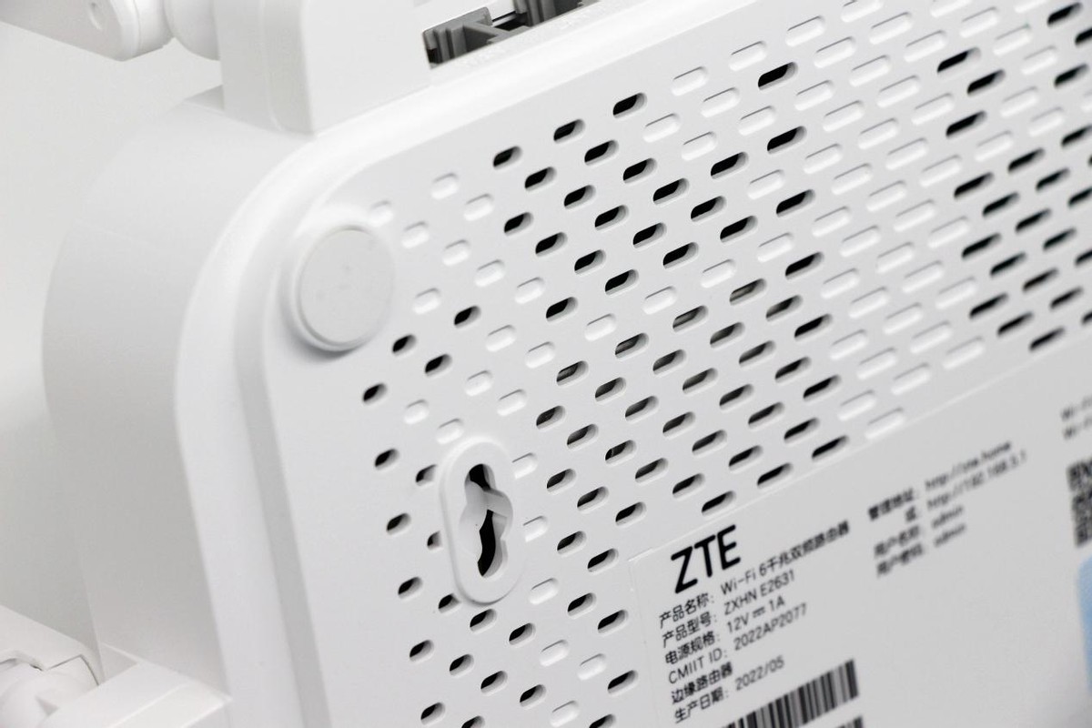 这款中兴AX3000路由器底部是满满的散热孔,还有个标签贴有路由器的参数和入网许可。看下底部还有壁挂的孔位呢。四个角的位置还有防护垫的设计,简单的小细节,也能体现品牌的实力。