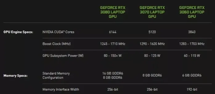 功率方面:RTX 3060 Laptop最低功率为60w(Max-Q版本),最高为115w; RTX 3070最低80w,最高125w。RTX 3080 最低80w,最高150w。