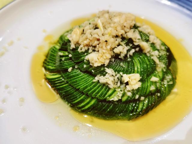 在扬州品扬州宴,菜端上来就能看到惊喜,每一道菜,每一个摆盘,都非常漂亮,就拿一盘黄瓜来说,也是要切得极为精细,味道自然也是非常的好吃。上面图片来自于九炉分座,是淮扬菜传承地之一。
