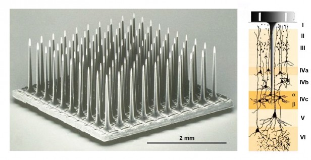 多通道神经电极上有100个微型电极——每个长约1毫米,它们看起来就像是一个微型的钉床。每个电极可以向1-4个神经元传输电流。在患者头部植入多通道神经电极时,电极会穿过大脑表面。
