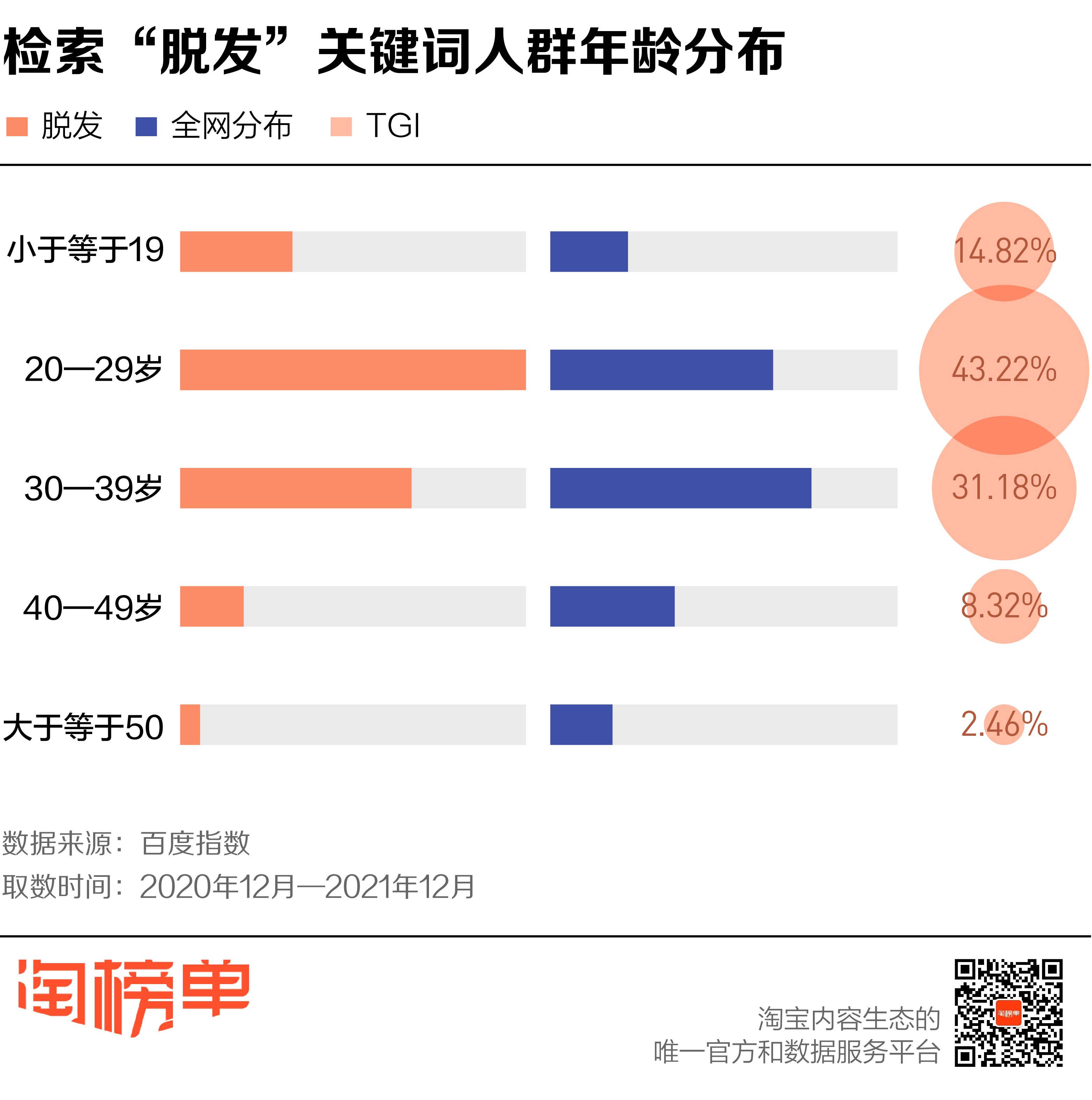 在关注脱发信息的人群中,20—29岁的群体占比最高,接近50%,其次则是30—39岁人群。