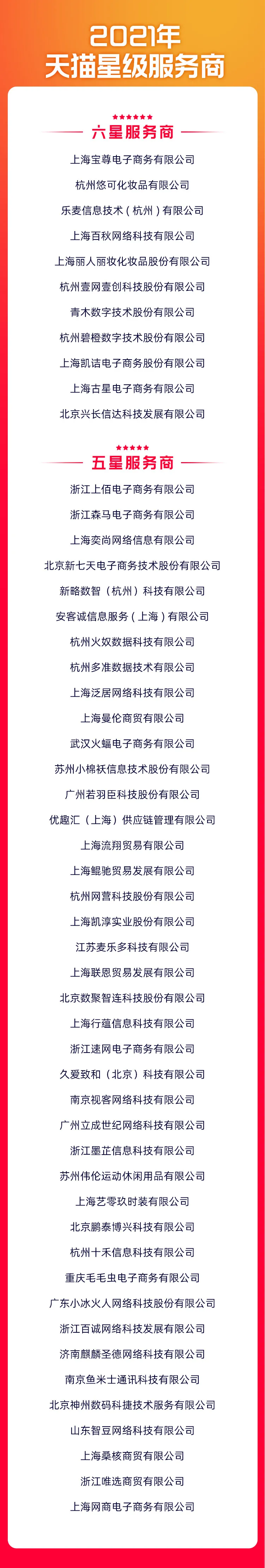 7月29日,在上海举行的天猫生态伙伴会议上,天猫公布了“2021天猫星级服务商六星五星服务商”,共有52家服务商上榜。此外,天猫还颁出了 2021年数字化先锋案例奖及数字化先锋合作伙伴奖。