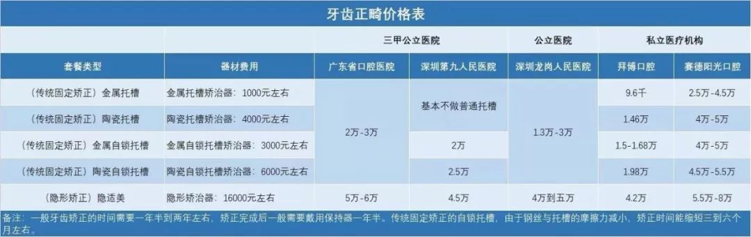 而21新健康记者在线查询了不同健康服务平台,如阿里健康、贝致等,发现私立医疗机构提供的传统固定矫正价格在7千-3.8万之间。 公立医院方面,以广东省口腔医院为例,固定矫正的价格则在2-3万不等。 而较小的公立医院,比如深圳市龙岗区人民医院,固定矫正价格在1.3-3万不等,具体价格根据不同类别不等。