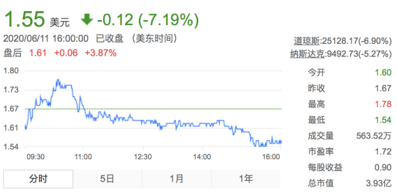 财报发布后,趣店的股价也应声连续下跌。截至当地时间6月11日,趣店股价报收1.55美元,总市值约为3.93亿美元,和巅峰时期的市值117亿美元相比跌去逾九成。