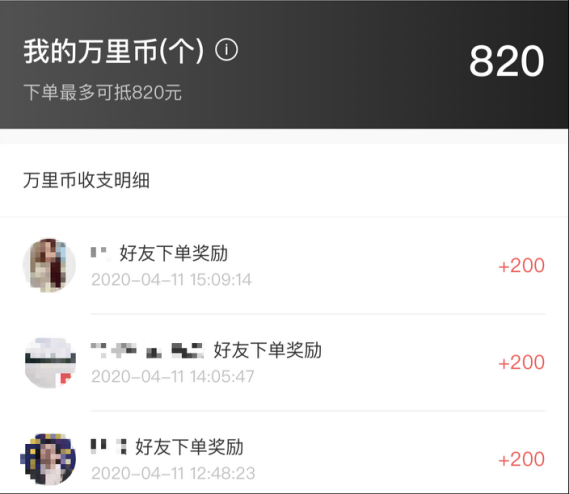 4月11日,邀请新用户下单后的返现金额为200元。图/受访者提供