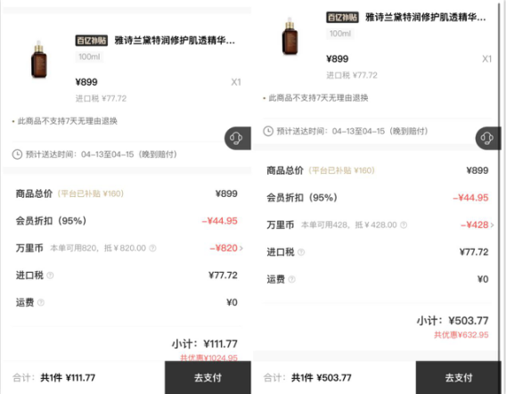 以汪女士获得820元返现来计算,最早购买某品牌精华可全部抵扣820元,仅需花费111元;规则调整后,一单只能抵扣428元,买同样的一瓶精华需要多花近400元,且为了花掉剩下的400元抵扣券,还需要再购买总额为800元的物品。
