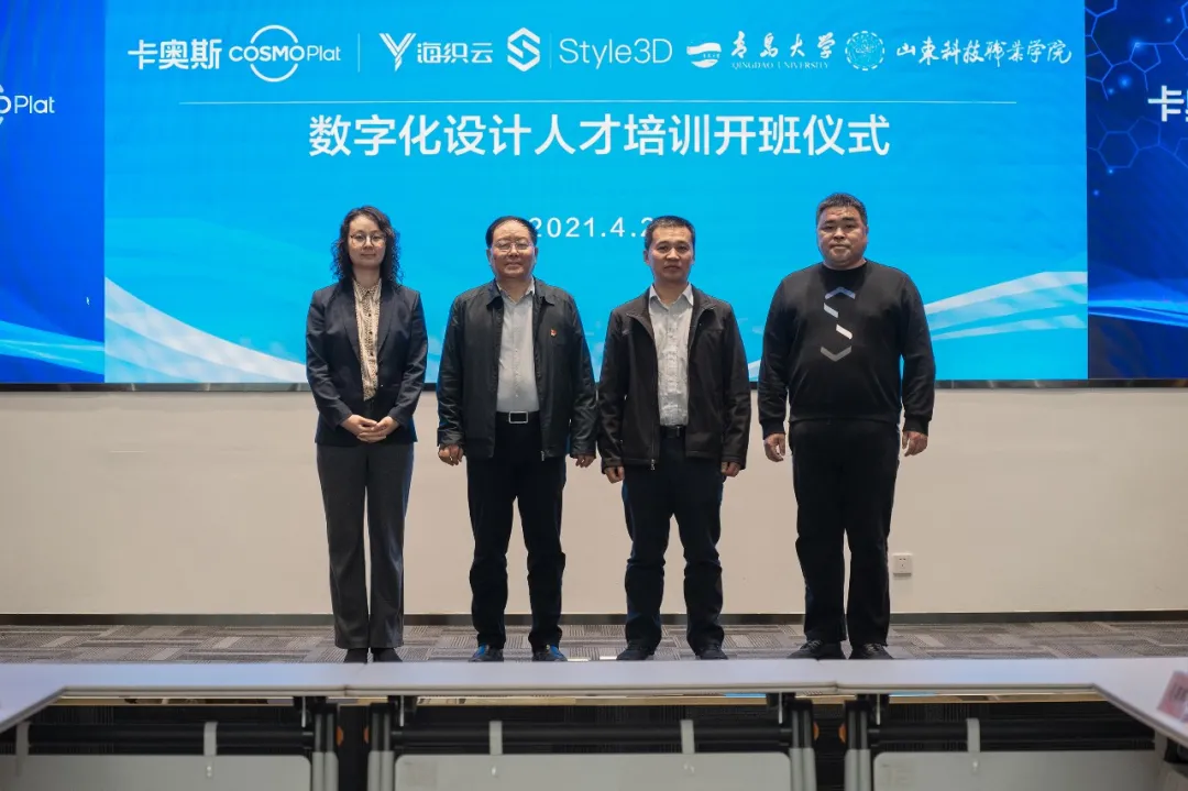 活动现场,凌迪科技Style3D市场总监肖荣、卡奥斯纺织服装行业总经理王晓凤,青岛大学纺织服装学院院长许长海及山东科技职业学院院长刘桂玉共同举行了数字化设计人才培训开班仪式,也标志着“蒲公英百千万”数字化人才培训计划正式启动。