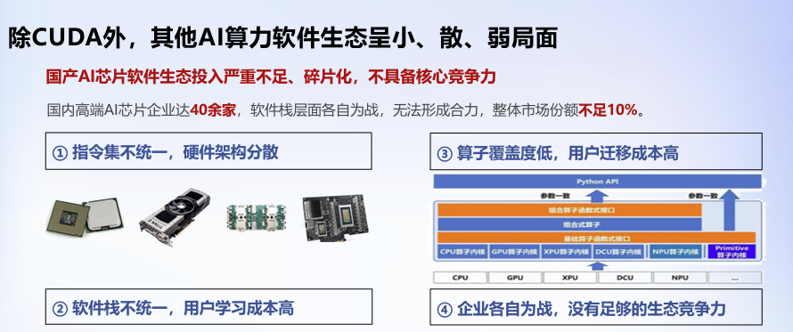 谢涛指出,这样的一个道路虽然能够解燃眉之急,但是长远来看它还是受制于人。当然,目前走非CUDA路线的AI芯片公司,整体上也是呈“小、散、弱”的局面。这主要是由于:1、指令集不统一,硬件架构分散;2、软件栈不统一,用户学习成本高;3、算子覆盖度低,用户迁移成本高;4、企业各自为战,没有足够的生态竞争力。