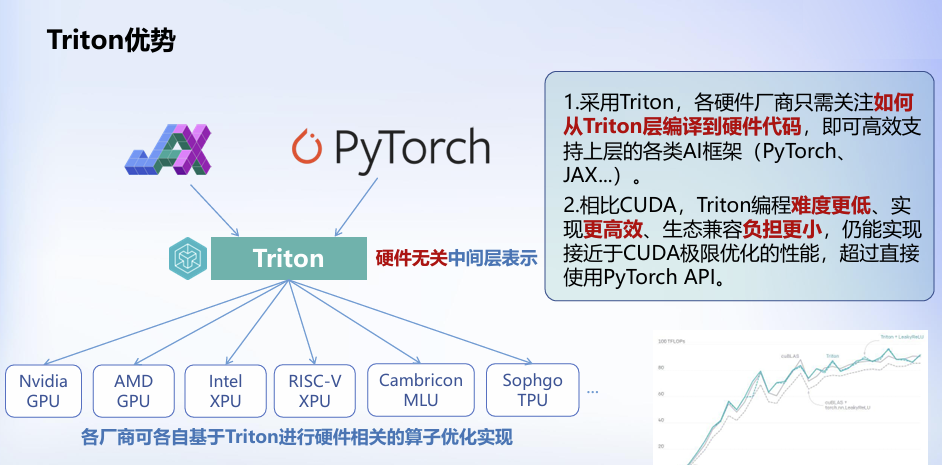 另一方面,RISC-V也不是一个排他的思路,英伟达未来可能也会去拥抱它。英伟达开源的系统软件栈Triton,虽然主要是支撑英伟达的GPGPU,(相当于它是一个“大烟囱”),但是现在也有一些国际公司很看好Triton生态,也是为它壮大生态、都做成了小烟囱。比如:寒武纪也针对Triton发布一些对寒武纪比较优化的算子。所以,大家也可以通过RISC-V团结起来,形成另外一个平行的“大烟囱”,因为英伟达也是积极的支持Triton生态。为了同一个事情我们可以去借力,然后用RISC-V把大家团结起来。包括谷歌等其它厂商也会慢慢的扩展,也许又成为另外一个大烟囱,一起把开放开源的Triton生态做大。