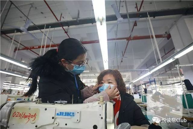 毕节市七星关经开区贵州省京福服装有限公司生产车间内工作人员正指导员工正确佩戴口罩