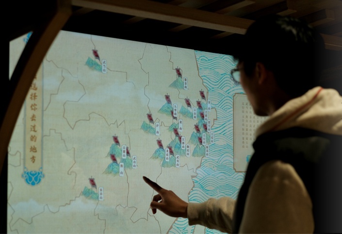 “诗路海韵”唐诗之路宁海数字馆选址于正在创建国家5A级旅游景区的前童古镇核心区,是浙东唐诗之路建设重点项目、重要节点的所在地。该馆以“行万里路、读万卷书”为核心意象,营造《徐霞客游记》开篇“人意山光,俱有喜态”的意境,展现徐霞客、方孝孺、潘天寿等古今士人气象,融合浙东唐诗之路建设关于“山水、名人、诗画”主题,打造浙东唐诗之路上别具一格的“海韵”文旅新地标。