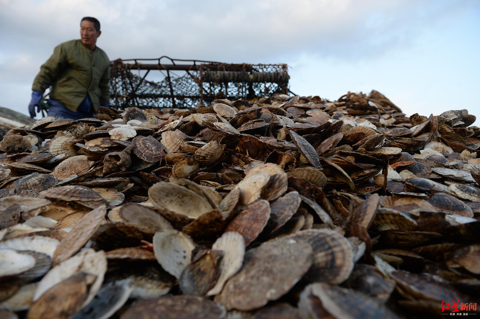 ▲獐子岛东獐子渔港,两天来拖贝船捞起的虾夷扇贝空壳